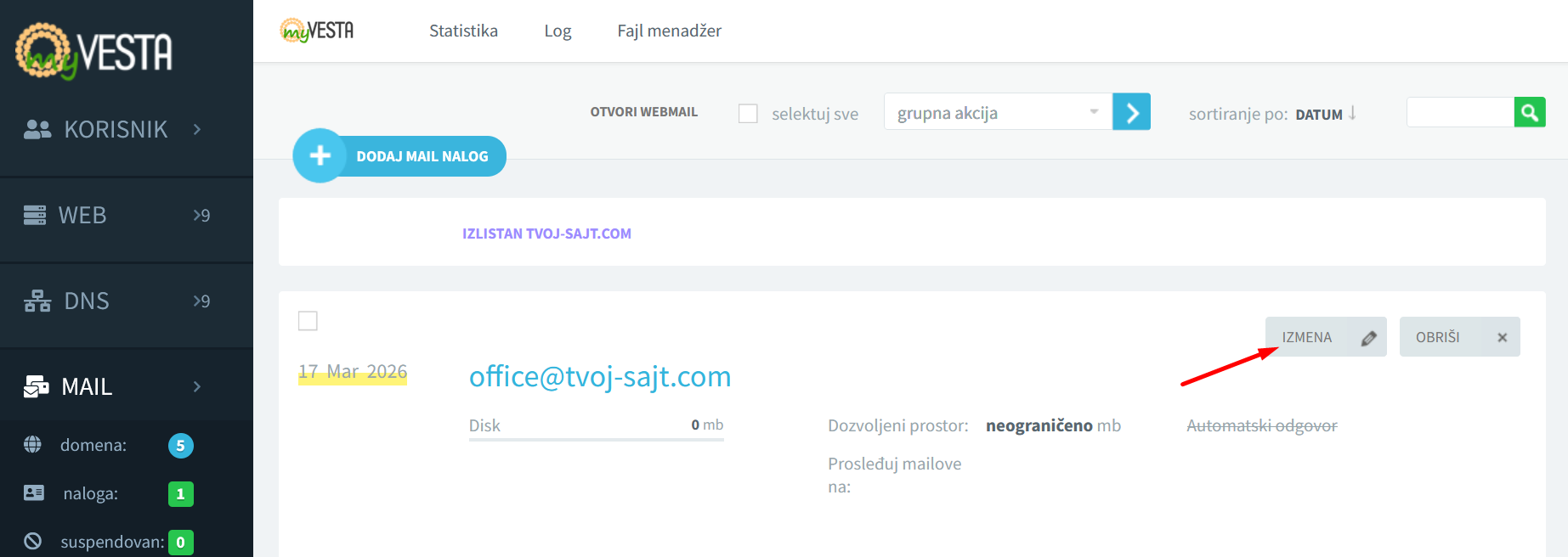 Kliknemo na dugme “IZMENA” iznad tog email naloga.