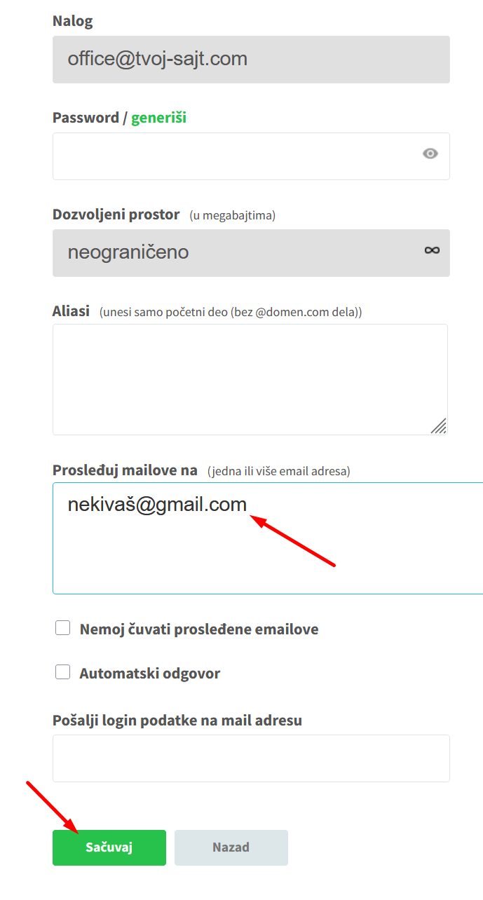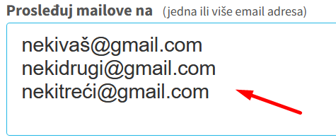 Možete i na više email adresa da forwardujete emailove tako što ćete svaku adresu uneti u novi red:
