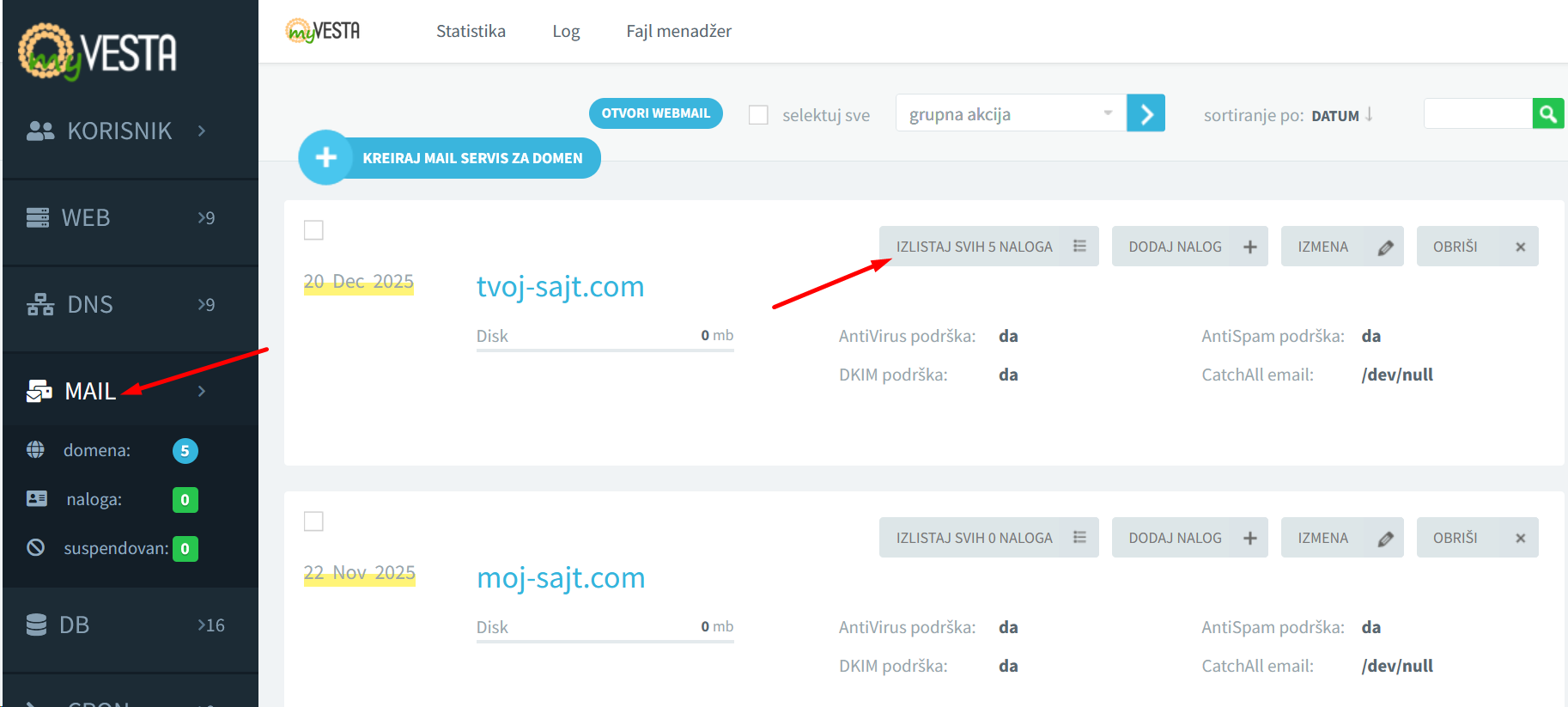 Zatim iznad svog domena kliknite na “IZLISTAJ SVIH N NALOGA”.