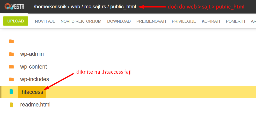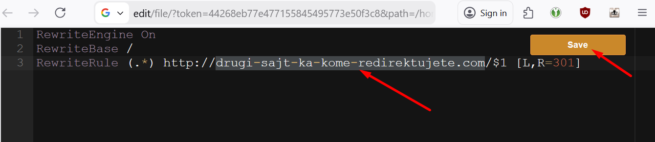 U trećoj liniji umesto “drugi-sajt-ka-kome-redirektujete.com” unesite adresu sajta na koji redirektujete.