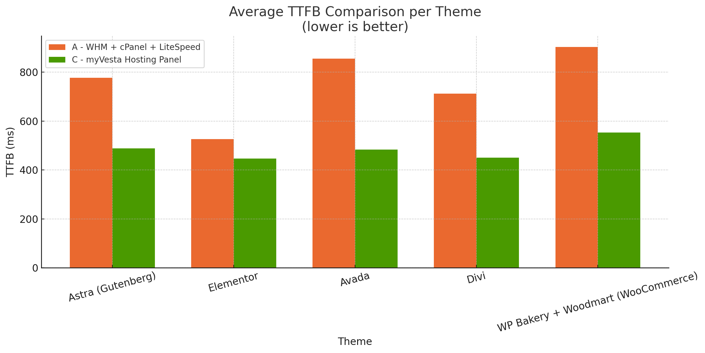 Rađen je detaljan benchmark myVeste i cPanela sa LiteSpeed serverom, na istom hardveru, sa popularnim WordPress temama. Meren je TTFB (Time To First Byte) iz različitih delova sveta, kao i brzina učitavanja stranice. Rezultat je bio vrlo jasan – WordPress sajtovi na myVesti su dosledno imali niže, to jest brže vreme odziva i pod opterećenjem su izdržavali veći broj zahteva u sekundi od cPanela.